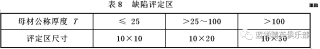 “5.1.5.1 圓形缺陷用圓形缺陷評定區(qū)進(jìn)行質(zhì)量分級評定,圓形缺陷評定區(qū)為一個(gè)與焊縫平行的矩形,其尺寸見表8。圓形缺陷評定區(qū)應(yīng)選在缺陷最嚴(yán)重的區(qū)域。