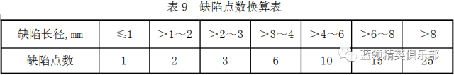 5.1.5.2 在圓形缺陷評定區(qū)內(nèi)或與圓形缺陷評定區(qū)邊界線相割的缺陷均應(yīng)劃入評定區(qū)內(nèi)。將評定區(qū)內(nèi)的缺陷按表9的規(guī)定換算為點(diǎn)數(shù),按表10的規(guī)定評判焊接接頭的質(zhì)量級別!