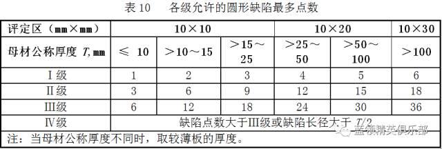 2、由于材質(zhì)或結(jié)構(gòu)等原因,進(jìn)行返修可能會(huì)產(chǎn)生不利后果的焊接接頭,經(jīng)合同各方同意,各級別的圓形缺陷點(diǎn)數(shù)可放寬1點(diǎn)~2點(diǎn)。(比如在測量圓形缺陷點(diǎn)在換算成點(diǎn)數(shù),若點(diǎn)數(shù)為18,母材厚度為19mm,嚴(yán)格按照J(rèn)B/T4730.2-2005標(biāo)準(zhǔn)的評級表評為IV級。若放寬1點(diǎn),則為17點(diǎn)評為III。)