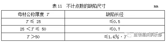 4、如下表中所示,母材厚度在規(guī)定范圍內(nèi)不計(jì)點(diǎn)數(shù)的缺陷尺寸。若母材公稱厚度為23mm,當(dāng)缺陷長徑小于0.5mm,則該缺陷不計(jì)入點(diǎn)數(shù)換算。