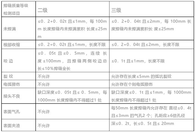 2.焊縫表面不得有裂紋、焊瘤等缺陷。一級、二級焊縫不得有表面氣孔、夾渣、弧坑裂紋、電弧擦傷等缺陷。且一級焊縫不許有咬邊、未焊滿、根部收縮等缺陷。